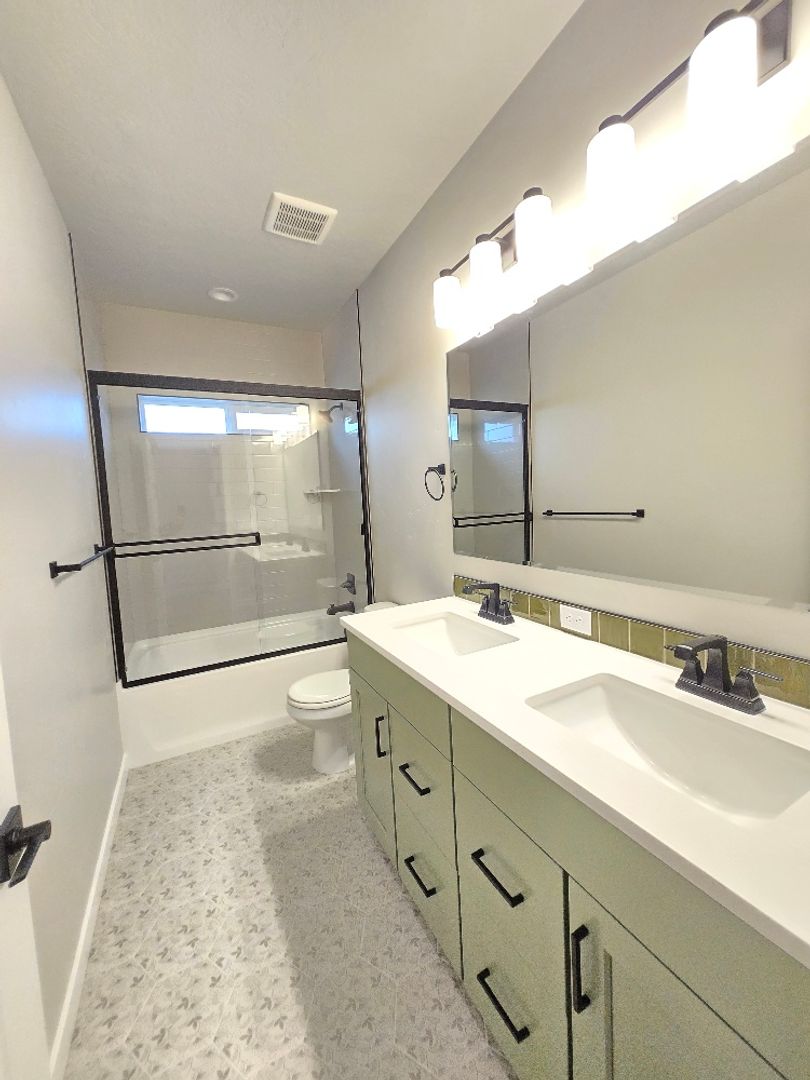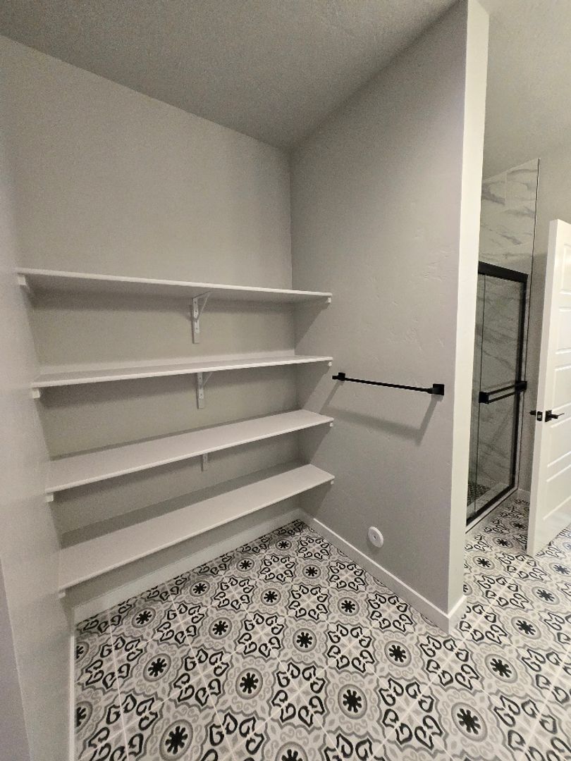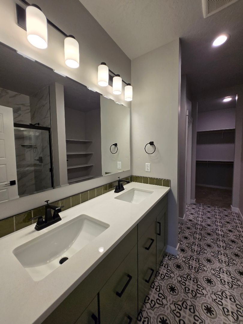 The primary suite is a true retreat, featuring a full tile shower, dual vanities, and a spacious walk-in closet. Each bathroom showcases its own unique custom tile and backsplash, with two of the three offering full tile showers.